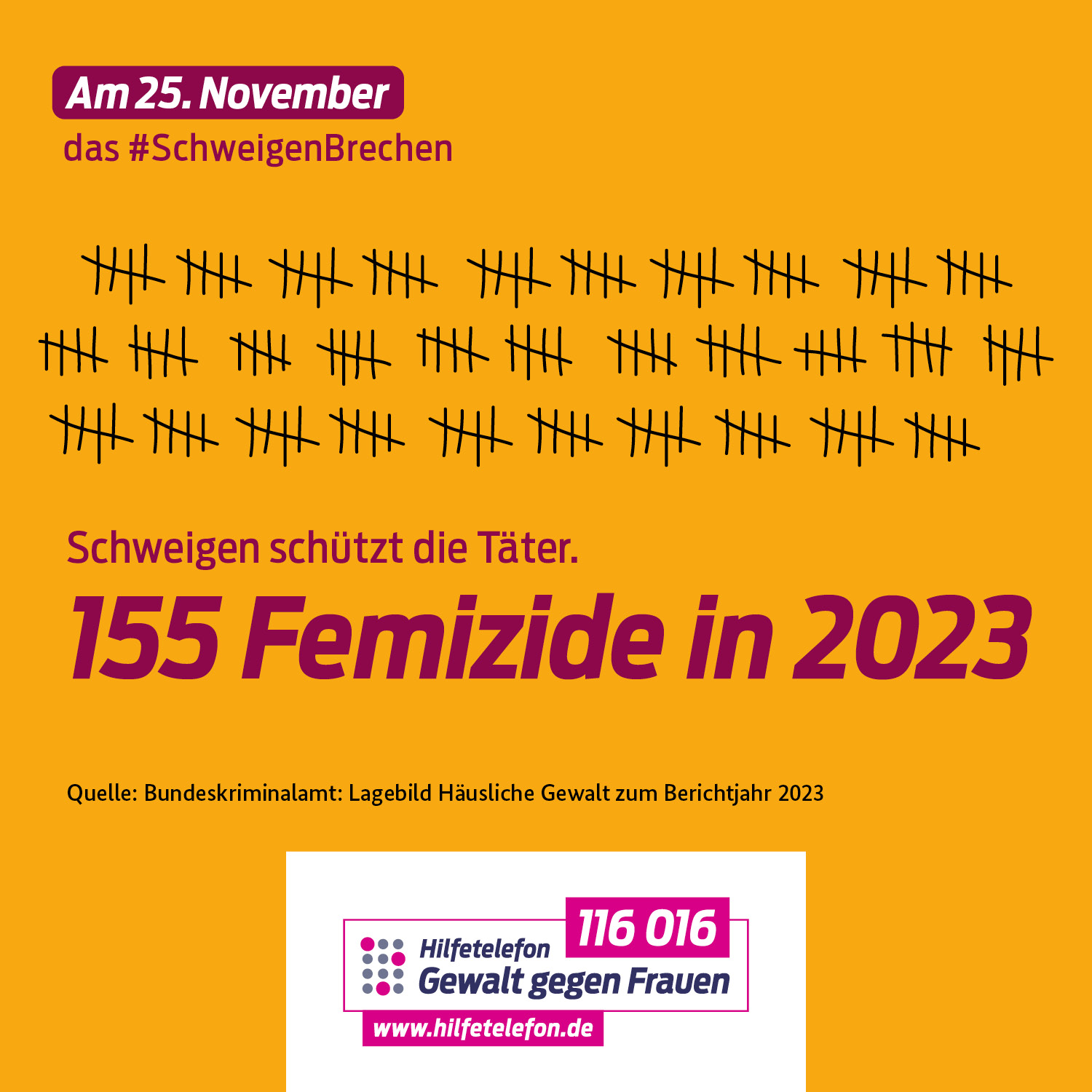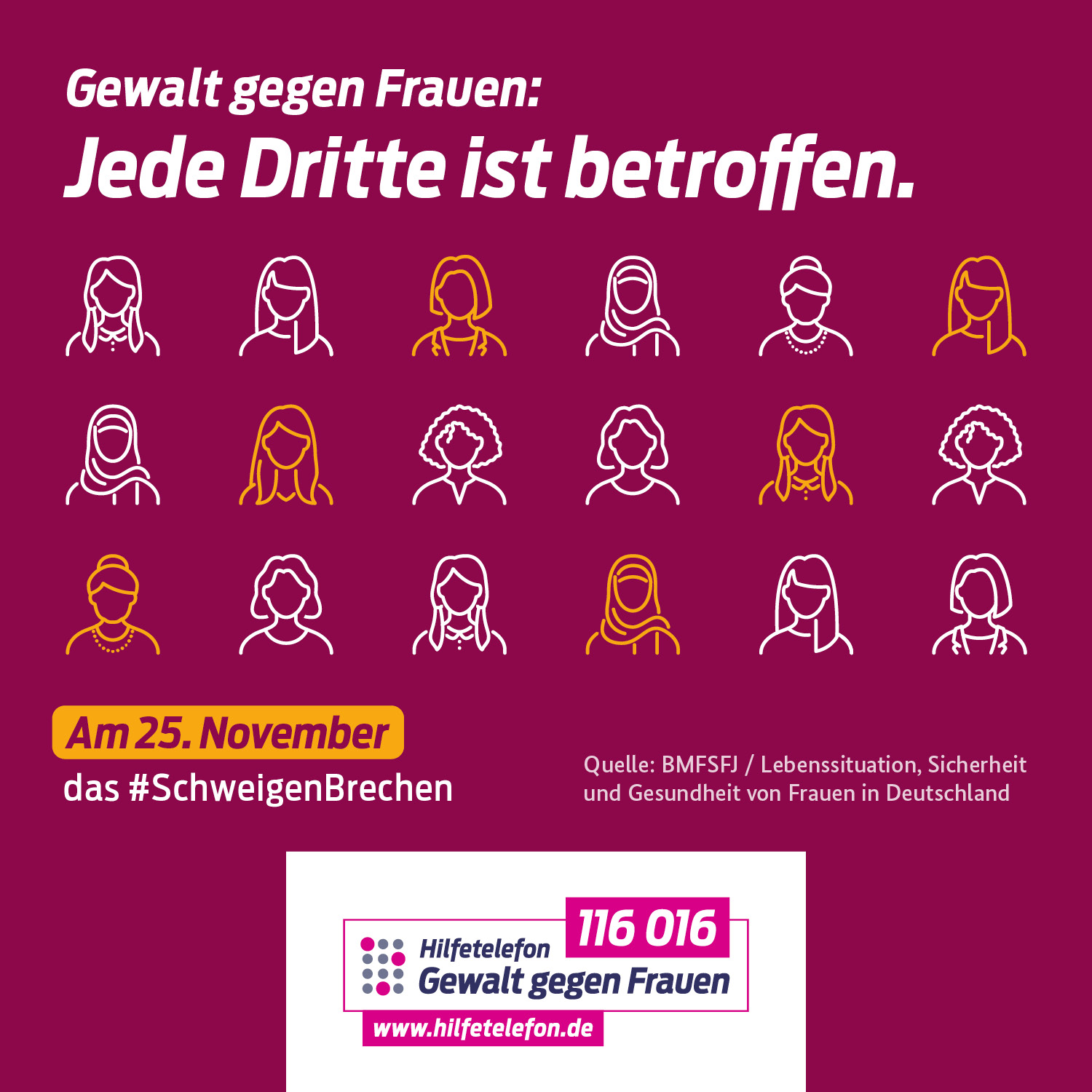 Wenn Sie oder jemand in Ihrem Umfeld Unterstützung braucht, zögern Sie nicht, das Hilfetelefon Gewalt gegen Frauen unter 116 016 zu kontaktieren. Die Beratung ist anonym, kostenfrei, rund um die Uhr erreichbar und in 18 Sprachen möglich.