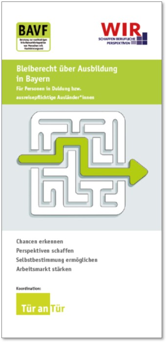Pünktlich zum Tag des Flüchtlings ist der Flyer Bleiberecht über Ausbildungsduldung in Bayern vom Projekt BAVF Plus bei Tür an Tür fertig geworden. Viele junge Geflüchtete sind jetzt am 01. September in die Ausbildung gestartet. Die Möglichkeit, einen Beruf zu erlernen, ist für Geflüchtete genauso wichtig wie für jede andere Person. Für Geflüchtete, insbesondere Personen mit einer Duldung und ausreisepflichte Personen, kommt hinzu, dass die Integration in den Arbeitsmarkt durch eine Ausbildung eine wesentliche Voraussetzung und Chance für den längerfristigen Aufenthalt sein kann.