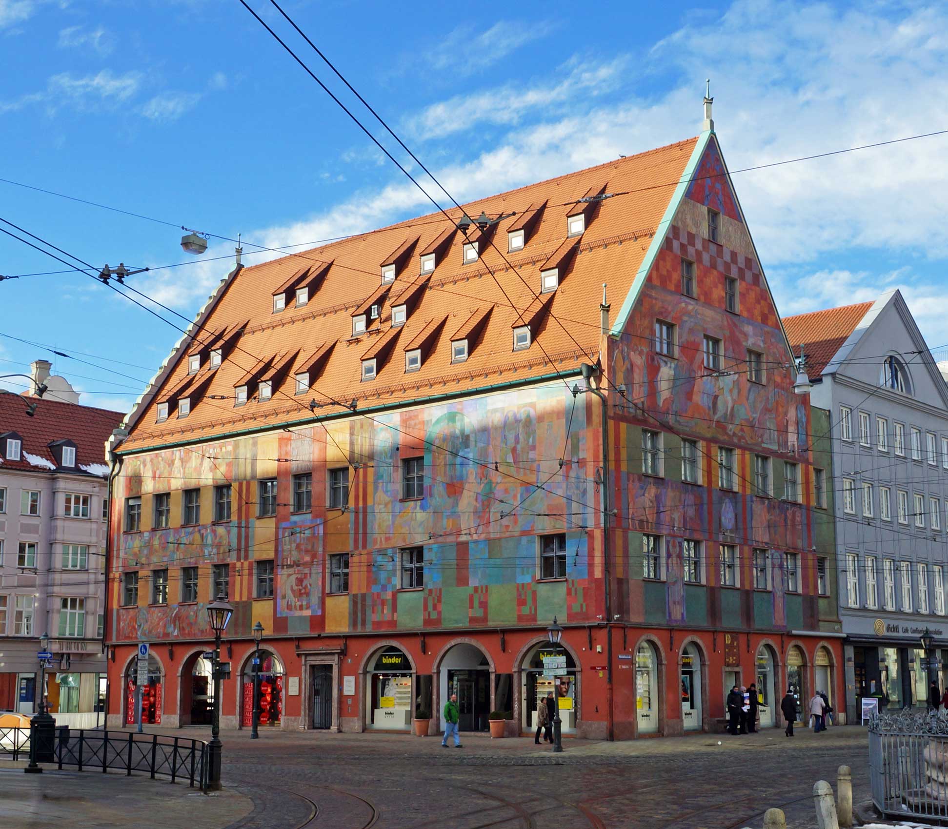Anstelle der heutigen Fresken befanden sich dort etwa 300 Jahre lang andere Darstellungen. Im Jahr 1606 schuf der Maler und Architekt Matthias Kager Wandgemälde, in denen venezianische Händler beim Baumwollhandel in osmanischen Gebieten gezeigt wurden – und wie sie diese Waren an Weber in Augsburg verkauften. Diese historischen Szenen wurden im Zuge der Fassadenrestaurierungen im 20. Jahrhundert entfernt und durch die heutigen Kompositionen ersetzt.